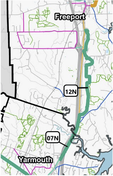 Finally, the sections from downtown Freeport to Yarmouth are included in GPCOG’s regional trail plan, numbered 12N and 07N.