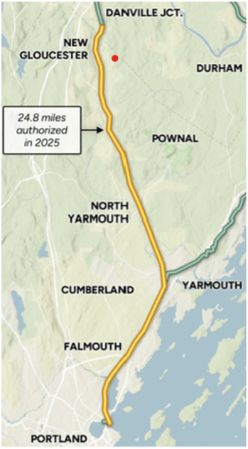 The Portland-to-Auburn segment covers the abandoned St. Lawrence and Atlantic railroad corridor, which is owned by the State of Maine.